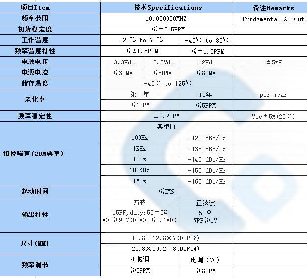 深圳市亿晶振业电子为您带来的10MHZ有源晶振TCXO被广泛应用于仪器频标,时间标准,频率校准(计时)等领域 10MHZ有源晶振TCXO四脚型 封装:DIP14(20.8*12.8mm) DIP08(12.8*12.8mm) 外壳:镀金外壳和常规外壳 输出波形:有两种,分别是方波和正弦波其中99%的客户用方波, 波形特点:方波特点:方波的输出直流电压一般是晶振电源的50%,如电源3.3V,方波直流电压一般是1.65V,用万用表可测量, 正弦波特点:幅值一般大于1V/50欧 电压:常用的有两种,3.3V和5V 微调方式:有机械微调,电压微调,固定不可微调三种方式 机械微调的范围(5PPM)一般常规是机械微调,面上有圆孔,经圆孔,利用专业工具结合专业测试仪器微调 电压微调的范围(5PPM)选购时需选购带压控功能的就是电压微调 固定不可微调,选购是需选固定不调