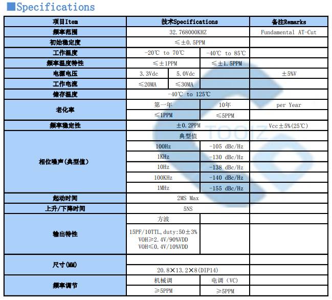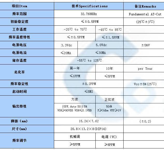 深圳市亿晶振业电子为您带来的低频高精度32.768KHZ温补晶振TCXO产品被广泛应用于通讯,网络,单片机,汽车采集设备等领域 32.768KHZ温补晶振TCXO四脚型 封装:DIP14(20.8*12.8mm) 外壳:镀金外壳和常规外壳 输出波形为方波输出, 波形特点:方波特点:方波的输出直流电压一般是晶振电源的50%,如电源3.3V,方波直流电压一般是1.65V,用万用表可测量, 电压:常用的有两种,3.3V和5V 微调方式:有机械微调,固定不可微调俩种方式 机械微调的范围(5PPM)一般常规是机械微调,面上有圆孔,经圆孔,利用专业工具结合专业测试仪器微调 固定不可微调,选购是需选固定不调 32.768KHZ温补晶振TCXO参数表: