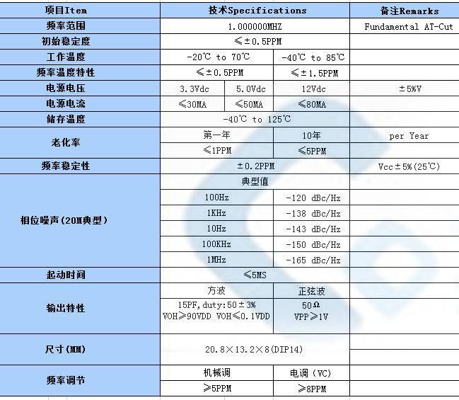 深圳市亿晶振业电子为您带来的有源晶振——高精度TCXO1MHZ温补晶振产品被广泛应用于仪器频标,时间标准,频率校准等领域 高精度TCXO1MHZ温补晶振四脚型 封装:DIP14(20.8*12.8mm) DIP08(12.8*12.8mm) 外壳:镀金外壳和常规外壳 输出波形为方波, 波形特点:方波特点:方波的输出直流电压一般是晶振电源的50%,如电源3.3V,方波直流电压一般是1.65V,用万用表可测量, 电压:常用的有两种,3.3V和5V 微调方式:有机械微调,电压微调,固定不可微调三种方式 机械微调的范围(5PPM)一般常规是机械微调,面上有圆孔,经圆孔,利用专业工具结合专业测试仪器微调 电压微调的范围(5PPM)选购时需选购带压控功能的就是电压微调 固定不可微调,选购是需选固定不调 1MHZ温补晶振TCXO参数表: 全尺寸封装(DIP14):四个直插脚,尺寸为20.8*12.8MM,预留有可机械微调孔 半尺寸封装(DIP08):四个直插脚,尺寸为12.8*12.8MM,预留有可机械微调孔 全尺寸封装(DIP14):镀金外壳,四个直插脚,尺寸为20.8*12.8MM,预留有可机械微调孔 半尺寸(DIP08):四个直插脚,尺寸为12.8*12.8MM,无微调孔 全尺寸封装(DIP14):四个直插脚,尺寸为20.8*12.8MM,无微调孔 方波示意图 方波测试示意图