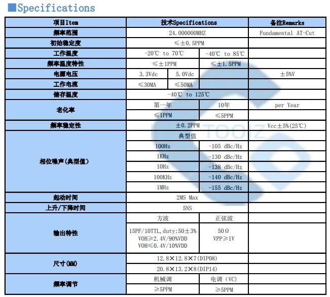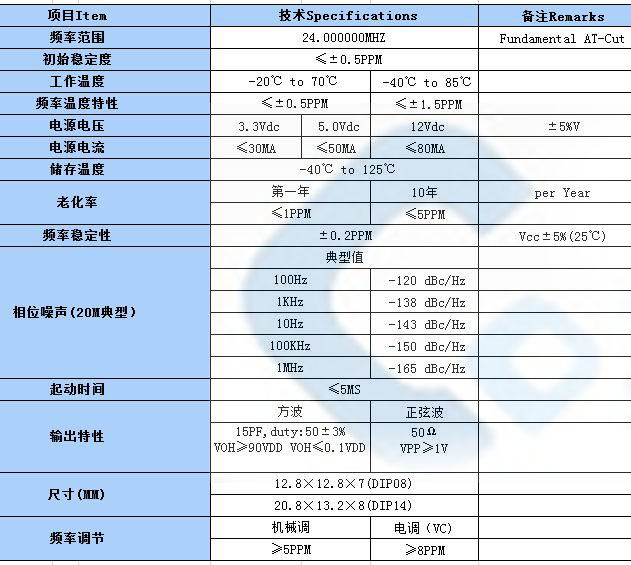 深圳市亿晶振业电子为您带来的24MHZ温补晶振TCXO被广泛应用于音响,通讯,网络等领域 24MHZ温补晶振TCXO四脚型 封装:DIP14(20.8*12.8mm) DIP08(12.8*12.8mm) 外壳:镀金外壳和常规外壳 输出波形:有两种,分别是方波和正弦波其中99%的客户用方波, 波形特点:方波特点:方波的输出直流电压一般是晶振电源的50%,如电源3.3V,方波直流电压一般是1.65V,用万用表可测量, 正弦波特点:幅值一般大于1V/50欧 电压:常用的有两种,3.3V和5V 微调方式:有机械微调,电压微调,固定不可微调三种方式 机械微调的范围(5PPM)一般常规是机械微调,面上有圆孔,经圆孔,利用专业工具结合专业测试仪器微调 电压微调的范围(5PPM)选购时需选购带压控功能的就是电压微调 固定不可微调,选购是需选固定不调
