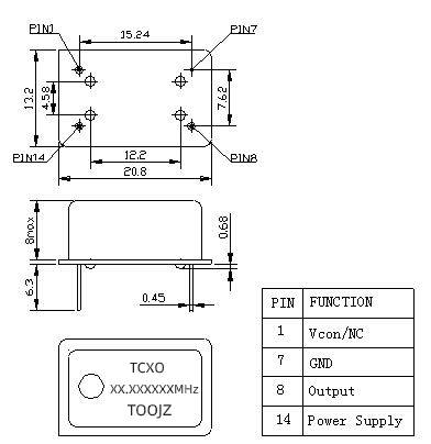 深圳市亿晶振业电子为您带来的有源晶振——高精度TCXO2MHZ温补晶振产品被广泛应用于仪器频标,时间标准,频率校准等领域 高精度TCXO2.097152MHZ温补晶振四脚型 封装:DIP14(20.8*12.8mm) 外壳:镀金外壳和常规外壳 输出波形为方波, 波形特点:方波特点:方波的输出直流电压一般是晶振电源的50%,如电源3.3V,方波直流电压一般是1.65V,用万用表可测量, 电压:常用的有两种,3.3V和5V 微调方式:有机械微调,电压微调,固定不可微调三种方式 机械微调的范围(5PPM)一般常规是机械微调,面上有圆孔,经圆孔,利用专业工具结合专业测试仪器微调 电压微调的范围(5PPM)选购时需选购带压控功能的就是电压微调 固定不可微调,选购是需选固定不调 2.097152MHZ温补晶振TCXO参数表: 全尺寸封装(DIP14):四个直插脚,尺寸为20.8*12.8MM,预留有可机械微调孔 全尺寸封装(DIP14):镀金外壳,四个直插脚,尺寸为20.8*12.8MM,预留有可机械微调孔 全尺寸封装(DIP14):四个直插脚,尺寸为20.8*12.8MM,无微调孔 方波示意图 方波测试示意图 封装尺寸图