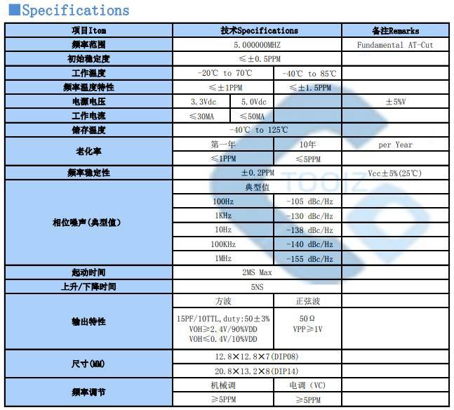 温补晶振TCXO5MHZ参数表