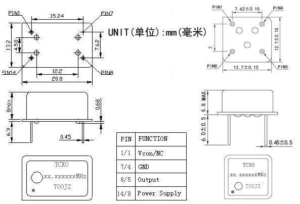 全尺寸封装(DIP14):镀金外壳,四个直插脚,尺寸为20.8*12.8MM,预留有可机械微调孔
